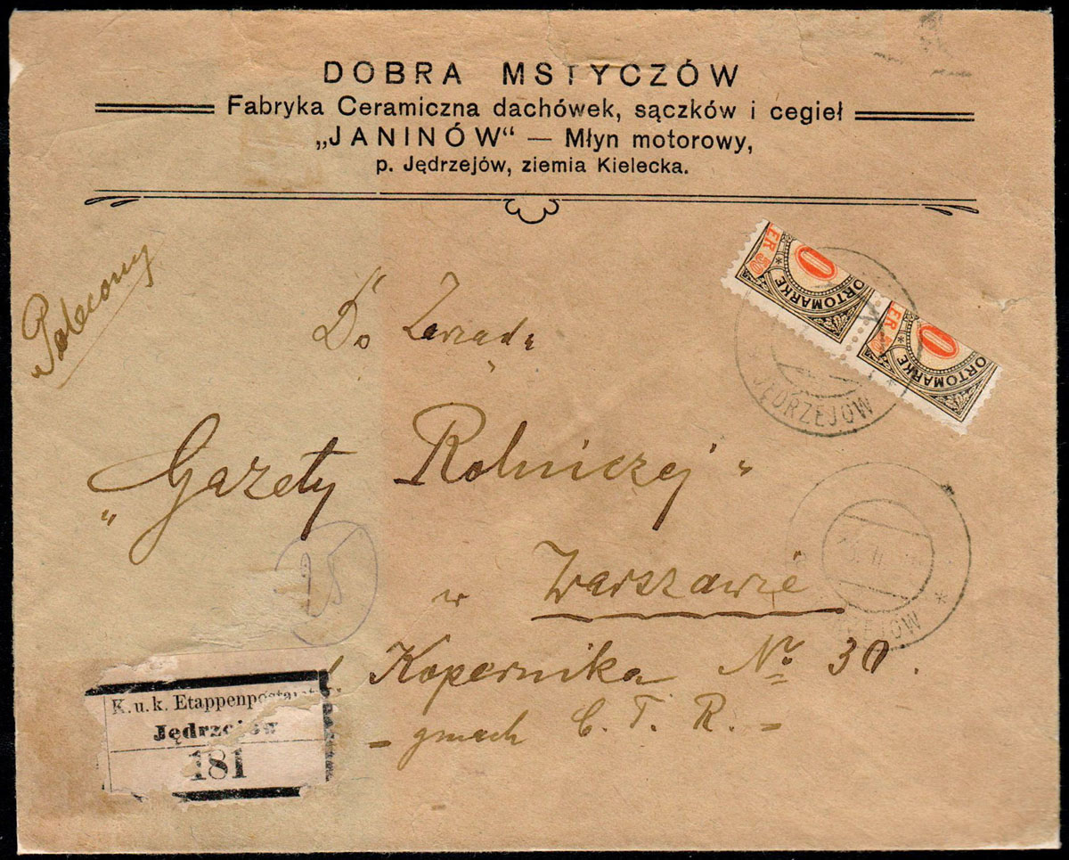 1919 współkursory, firmowy list polecony opłacony parką połówkowych znaczków Bośni i Hercegowiny wysłany 14.02.19 z Jędrzejowa do Warszawy, na odwrocie stempel odbiorczy. | Mi.12 |