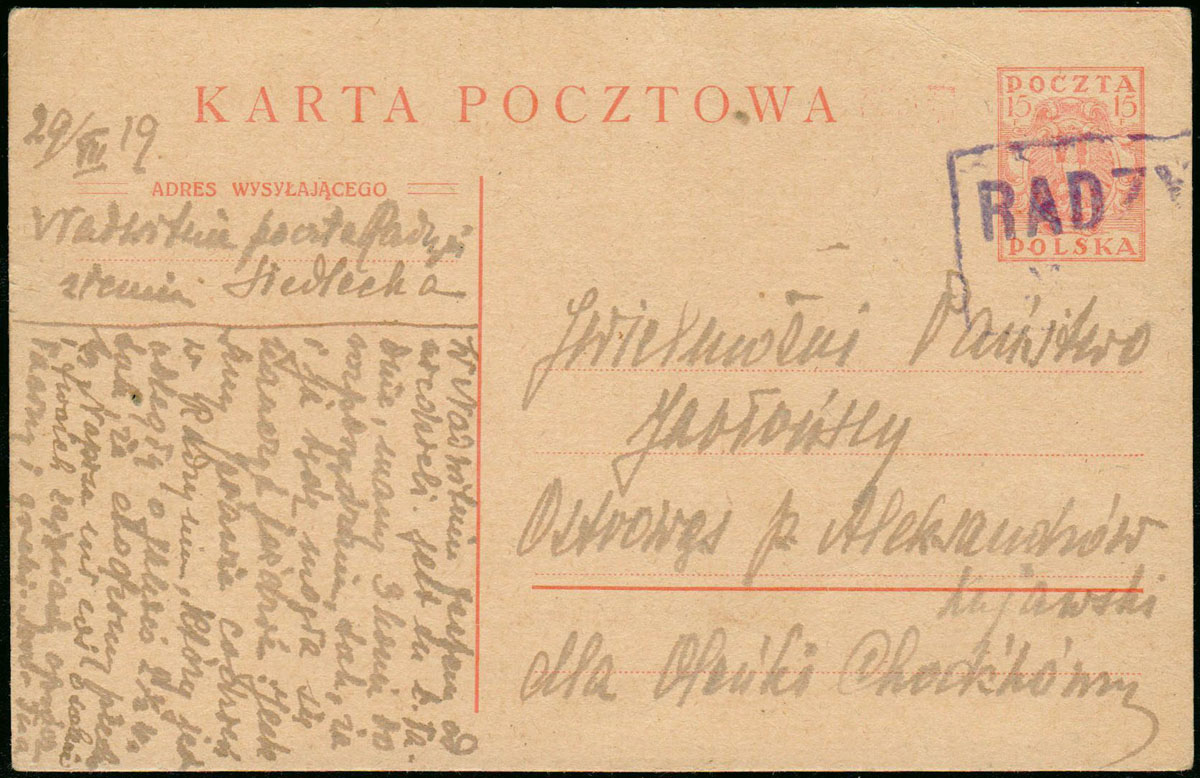 1919 Radzyń, kartka z Radzynia do Ostrowąs, prowizoryczny kasownik Radzynia. | Fi.Cp24 |