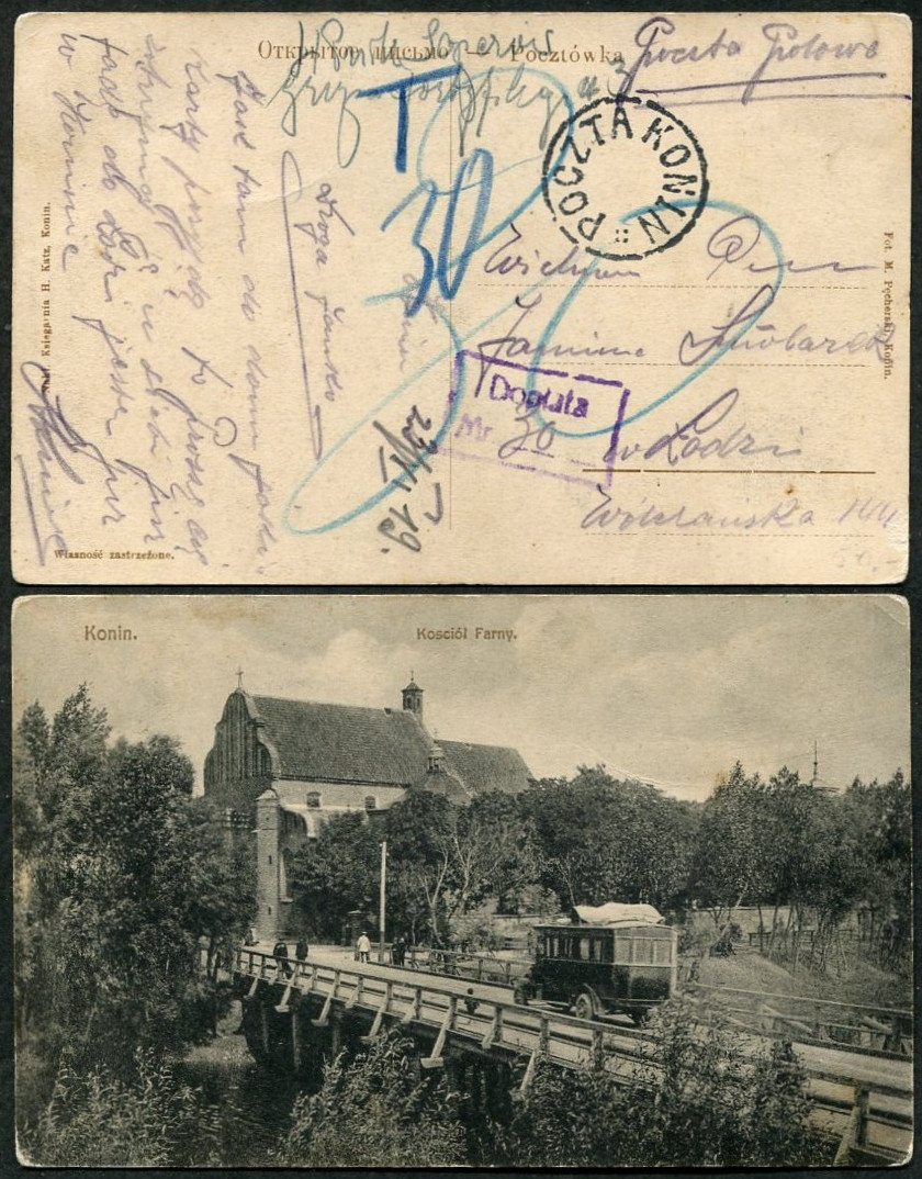 1919 Konin, ciekawa widokówka z Konina wysłana w 1919 r. ostemplowana datownikiem prowizorycznym Konina, dodatkowo stempel dopłaty. | |