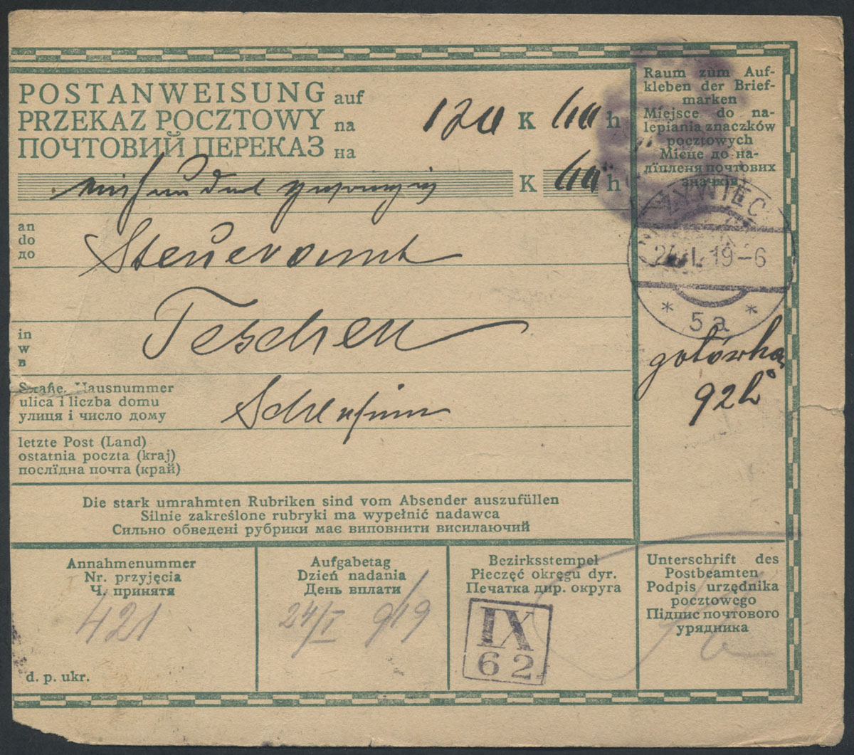 1919 przekaz pieniężny z Żywca do Cieszyna, adnotacja o opłacie gotówkowej, na odwrocie stempel odbiorczy. | |