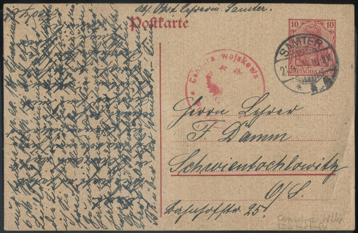 1919 kartka z Ostrowa nadana 5.09.19 do Niemiec, stempel cenzury wojskowej w Ostrowie - Cenzura Powstania Wielkopolskiego "Dozwolone / kontrola poczty / w Ostrowie", kartka zwrócona do nadawcy - niemiecki stempelek informujący, że adresat nieznany. | |