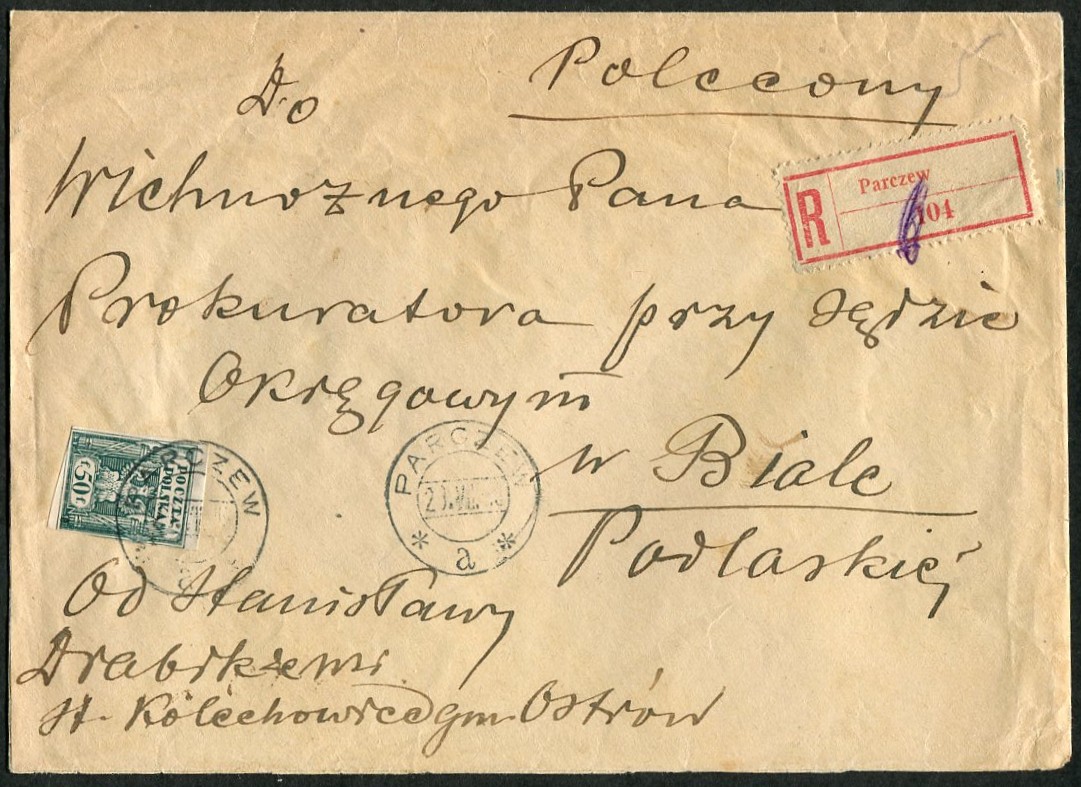 1919 Parczew, koperta listu poleconego wysłanego z Parczewa, na kopercie czerwona nalepka polecenia, są to pierwsze polskie nalepki polecenia. | |