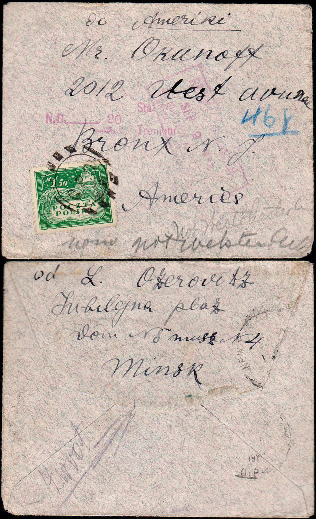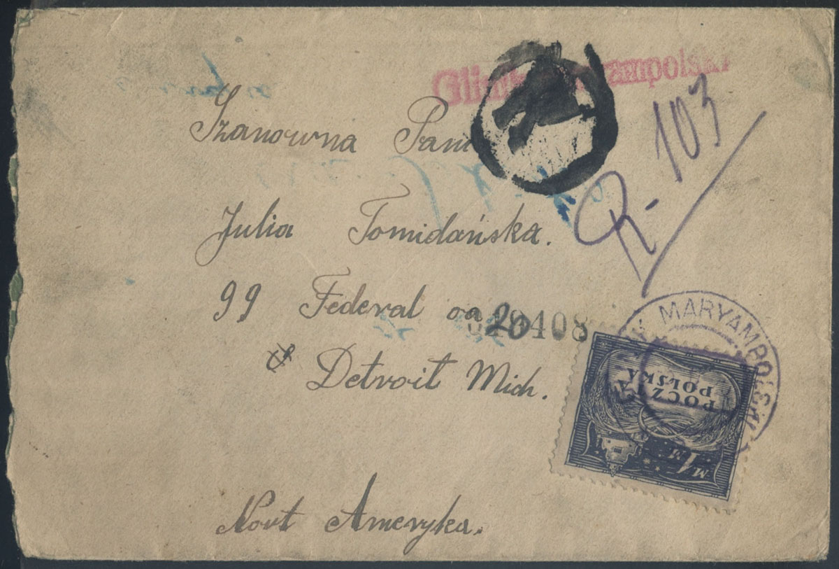 1920 Mińsk Litewski, list nadany w momencie ewakuacji polskiego urzędu pocztowego z Mińska Litewskiego (około 8 lipca 1920 r.) z powodu ofensywy Bolszewików. Z uwagi na zapakowane już akcesoria pocztowe dołożono również te nie ostemplowane listy do zabieranej ostemplowanej korespondencji. List z Polski został wyekspediowany do Stanów Zjednoczonych i dopiero tam znaczek polski został skasowany niemym stemplem G.P.O. Adresat nie został odnaleziony w USA i list został zwrócony do Polski. Nie było jednak możliwości zwrotu listu do nadawcy, ponieważ Mińsk Litewski nie znalazł się w granicach II Rzeczypospolitej i dlatego list skierowany został do Urzędu Niedoręczalnych Przesyłek. | Fi.93B |