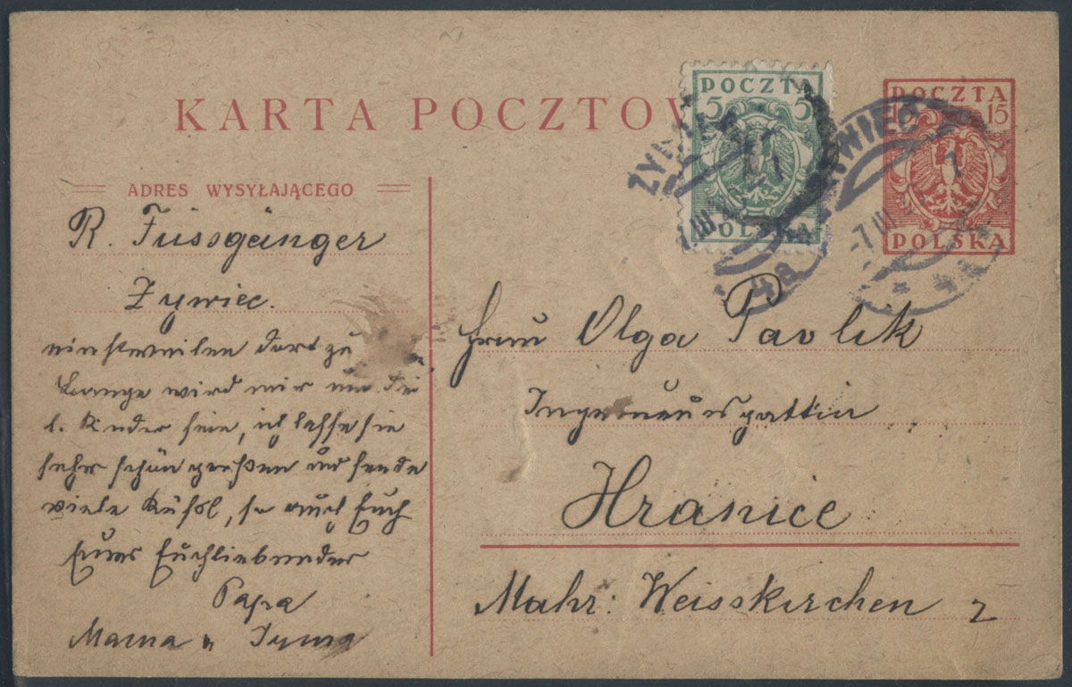 1920 kartka Żywca na Morawy. | Fi.86B, Cp30 |