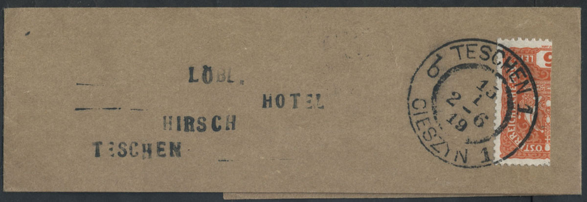 1919 współkursory, miejscowo użyta opaska gazetowa w Cieszynie opłacona połówką austriackiego znaczka za 6 hal. | |