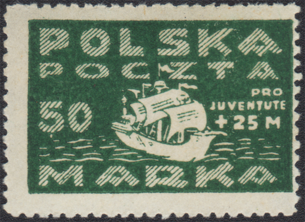 1920 PRO JUVENTUTE, 50+25M winietka charytatywna poświęcona wspieraniu praw dzieci i młodzieży przedstawiająca okręt z rozwiniętymi żaglami; bardzo dobry stan zachowania. | Fi.1 |