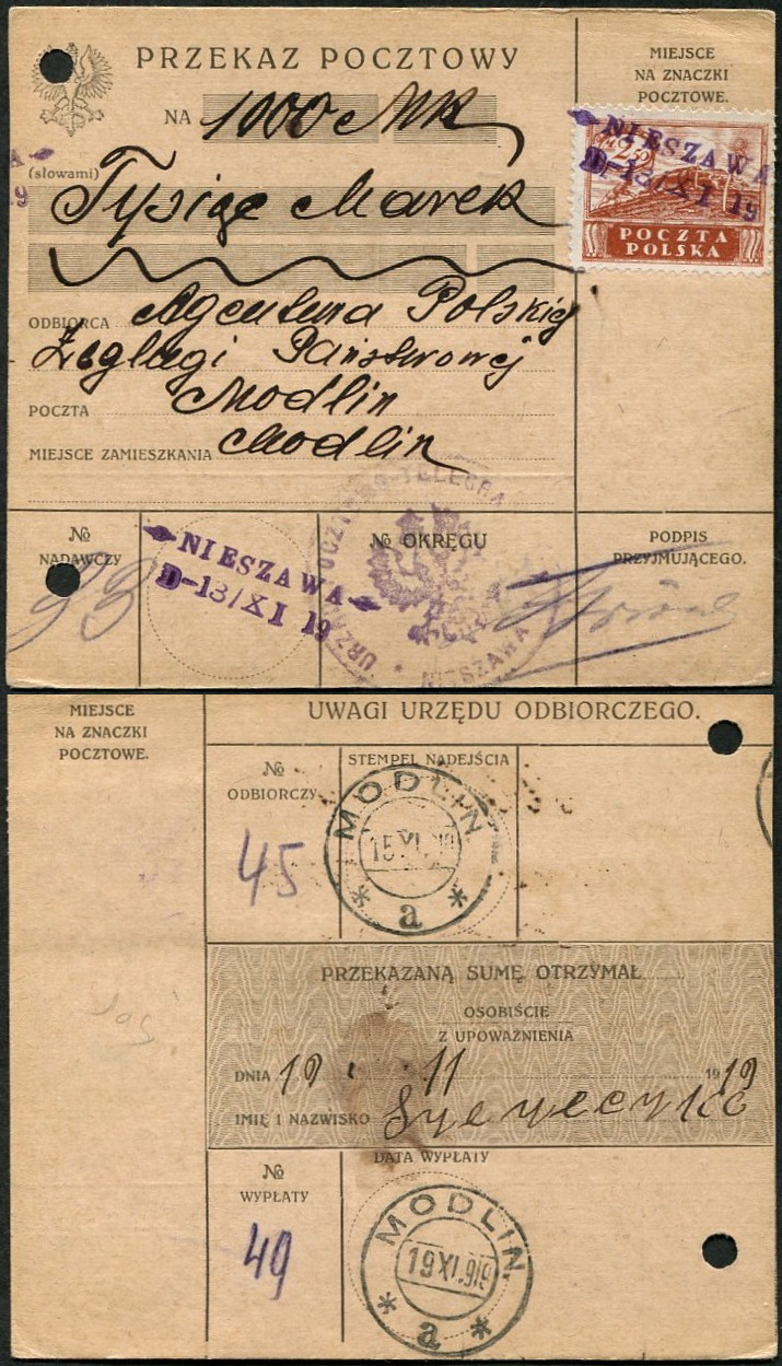 1919 Nieszawa, przekaz pieniężny z Nieszawy nadany 13.11.19 do Modlina, znaczki unieważnione stemplem prowizorycznym Nieszawy z dodatkowym stemplem urzędu pocztowego, na odwrocie stemple odbiorcze. | |