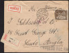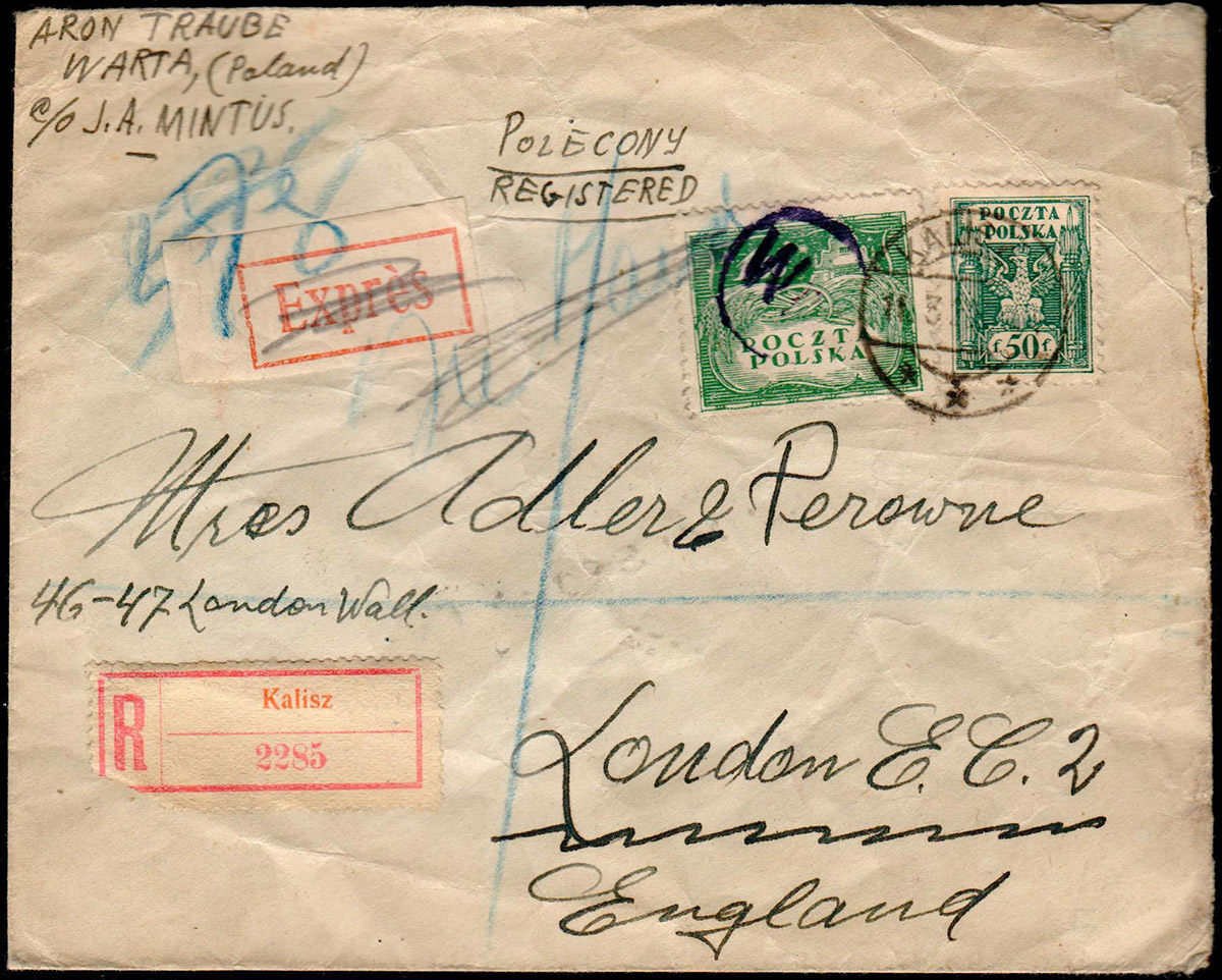 1920 ekspresowy list polecony z Kalisza do Wielkiej Brytanii, stempel warszawskiej cenzury wojskowej, czerwona erka Kalisza, na odwrocie kasownik odbiorczy. | Fi.91B, 93B |