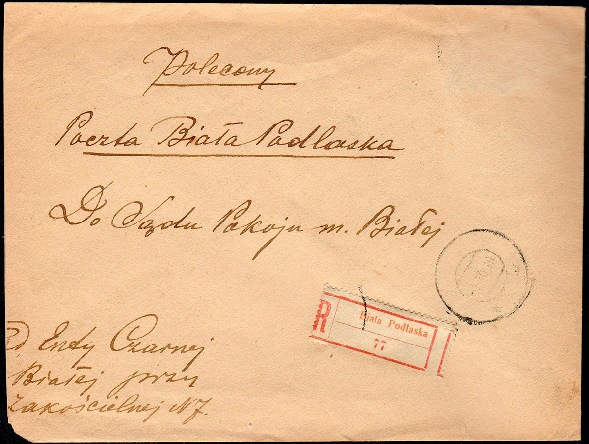 1919 miejscowy list polecony z Białej Podlaskiej, czerwona erka Biała Podlaska, prawdopodobnie odpadły znaczki opłaty, na odwrocie stempel odbiorczy. | |
