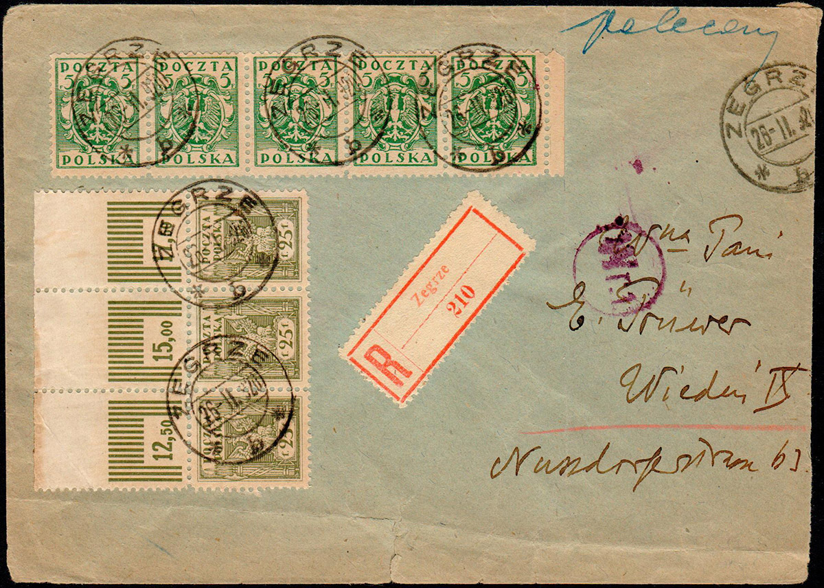 1920 list polecony z Zegrza do Austrii, czerwona erka Zegrza, stempel warszawskiej cenzury wojskowej. | Fi.86B, 90B |