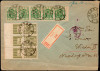 1920 miejscowy list polecony z Krakowa 15.VI.20, znaczek za 1 mk. z charakterystyczną usterką na 55 pozycji w arkuszu "plama nad lewą wieżyczką", opisane w PZP. | Fi.91B, 92B Mi.108, 109 |