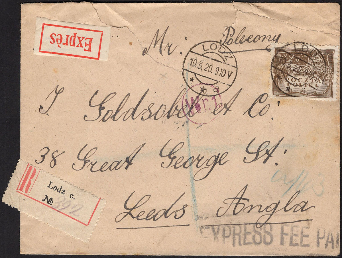 1920 list polecony z Łodzi do Anglii, stempel warszawskiej cenzury wojskowej, na odwrocie stempel odbiorczy. | Fi.94B |