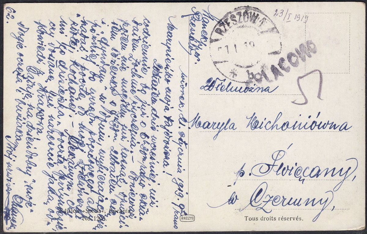 1919 kartka z Rzeszowa do Święcan 23 styczen 1919, stempelek opłaty gotówkowej. | |