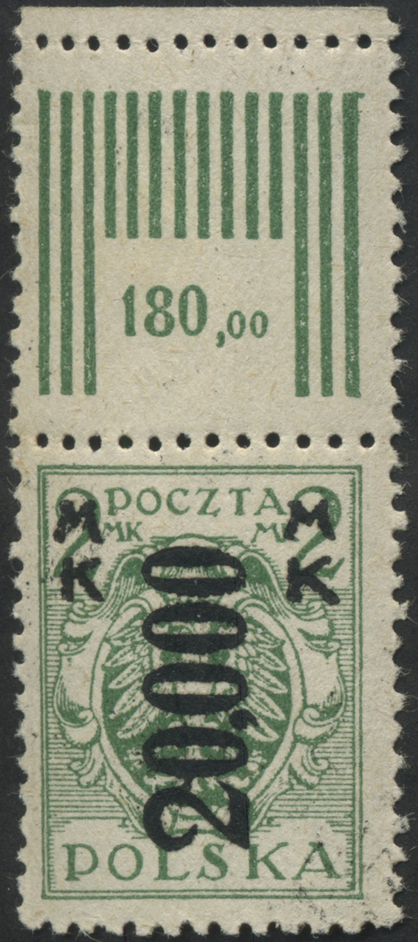 1923-24 wydanie przedrukowe, znaczek za 20000/2 mk. z silnie przesuniętym w dół nadrukiem, znacznie częściej spotyka się przesunięcia w bok, gwarancja z oznaczeniem MK Walocha. | Fi.168 MK3 Mi.189 |