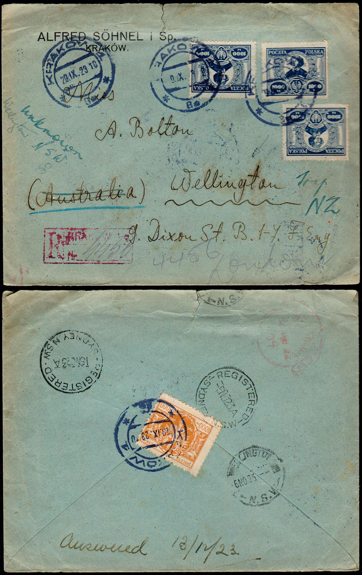 1923 list polecony list do Australii przekierowany do Nowej Zelandii wysłany z Krakowa 29.09.23, stemple odbiorcze Sydney i Wellington, małe naddarcie w górnej części koperty. | Fi.142, 164 |