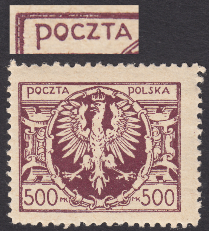 1923 duży orzeł na tarczy barokowej, znaczek za 500 mk. z niekatalogowanym błędem "litera O w POCZTA zgrubiona u dołu", gwarancja i opis Walocha. | Fi.151 B Mi.179 |