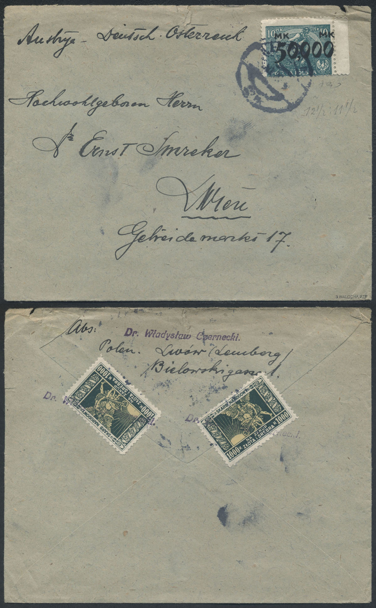 1923 list z Lwowa do Wiednia, na odwrocie nalepki na skarb narodowy, gwarancja Walocha. | Fi.170 |