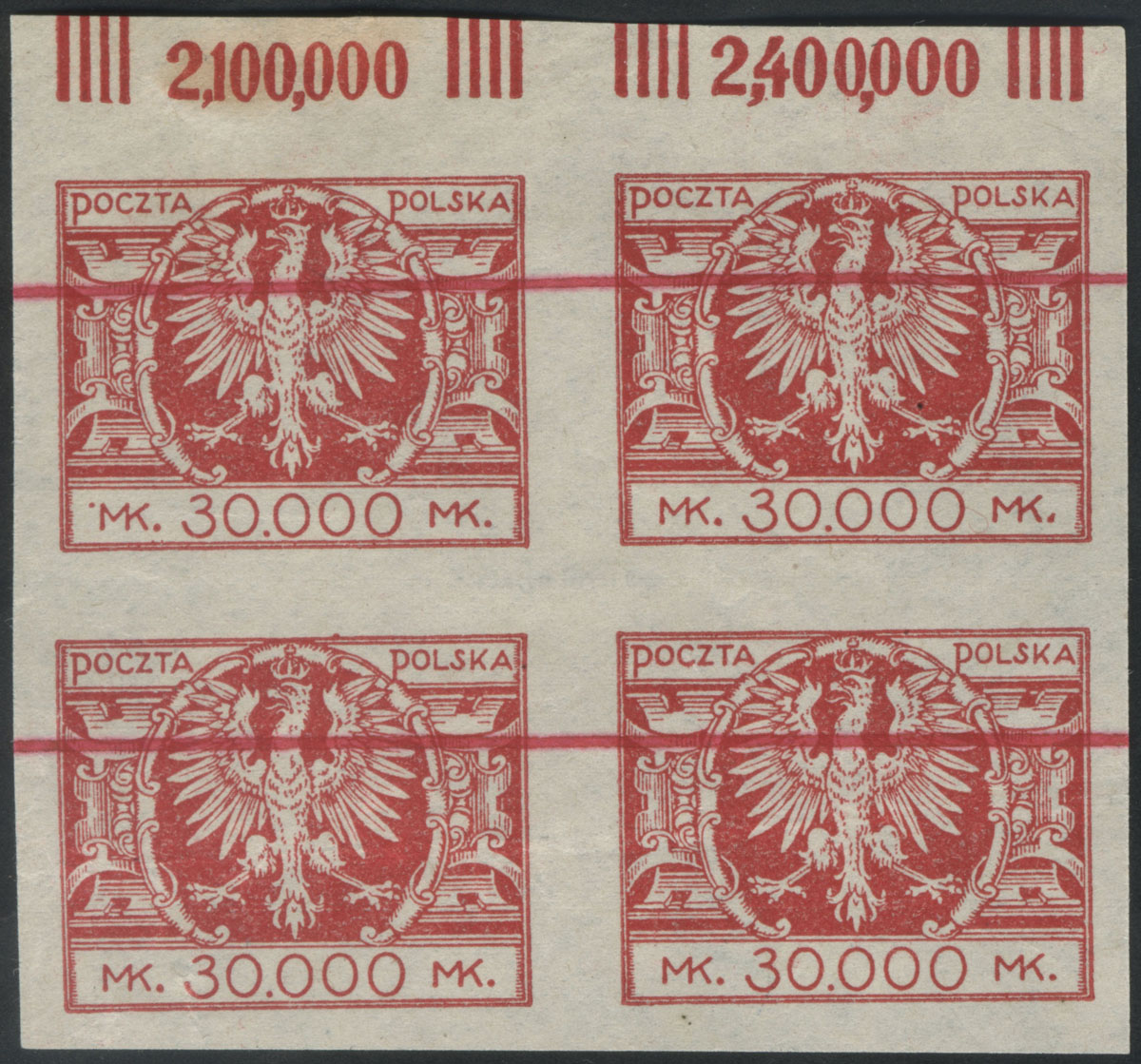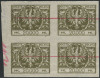 1923 duży orzeł na tarczy barokowej, czworoblok ciętych niegumowanych prób arkuszowych kreślonych czerwonym tuszem, ślad po zagięciu, gwarancja Ryblewski. | Fi.174P |