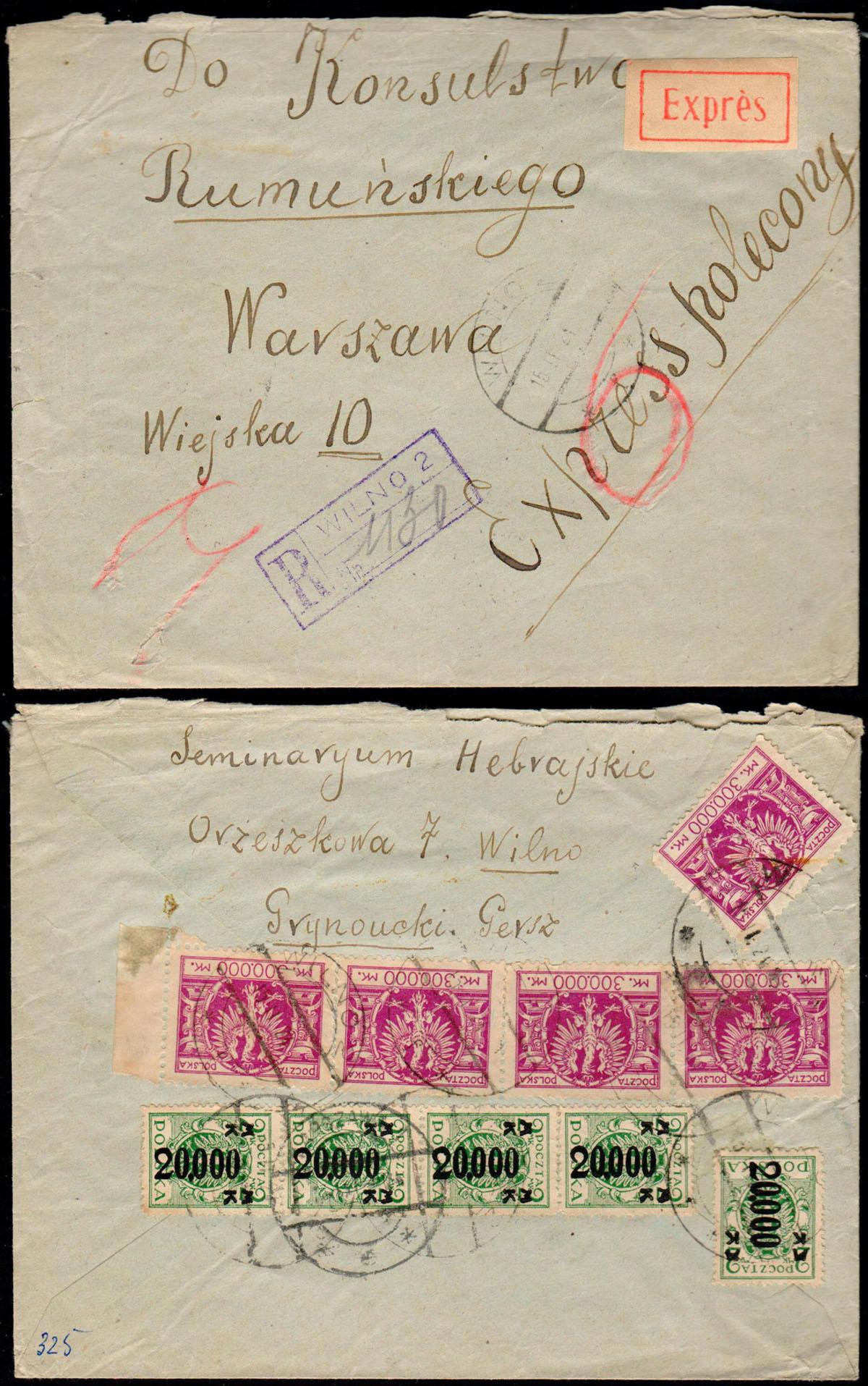 1924 hiperinflacja, ekspresowy list polecony z Wilna nadany 16.02.24 do Warszawy, opłata pocztowa 1.600.000 mk. | Fi.168, 178 |