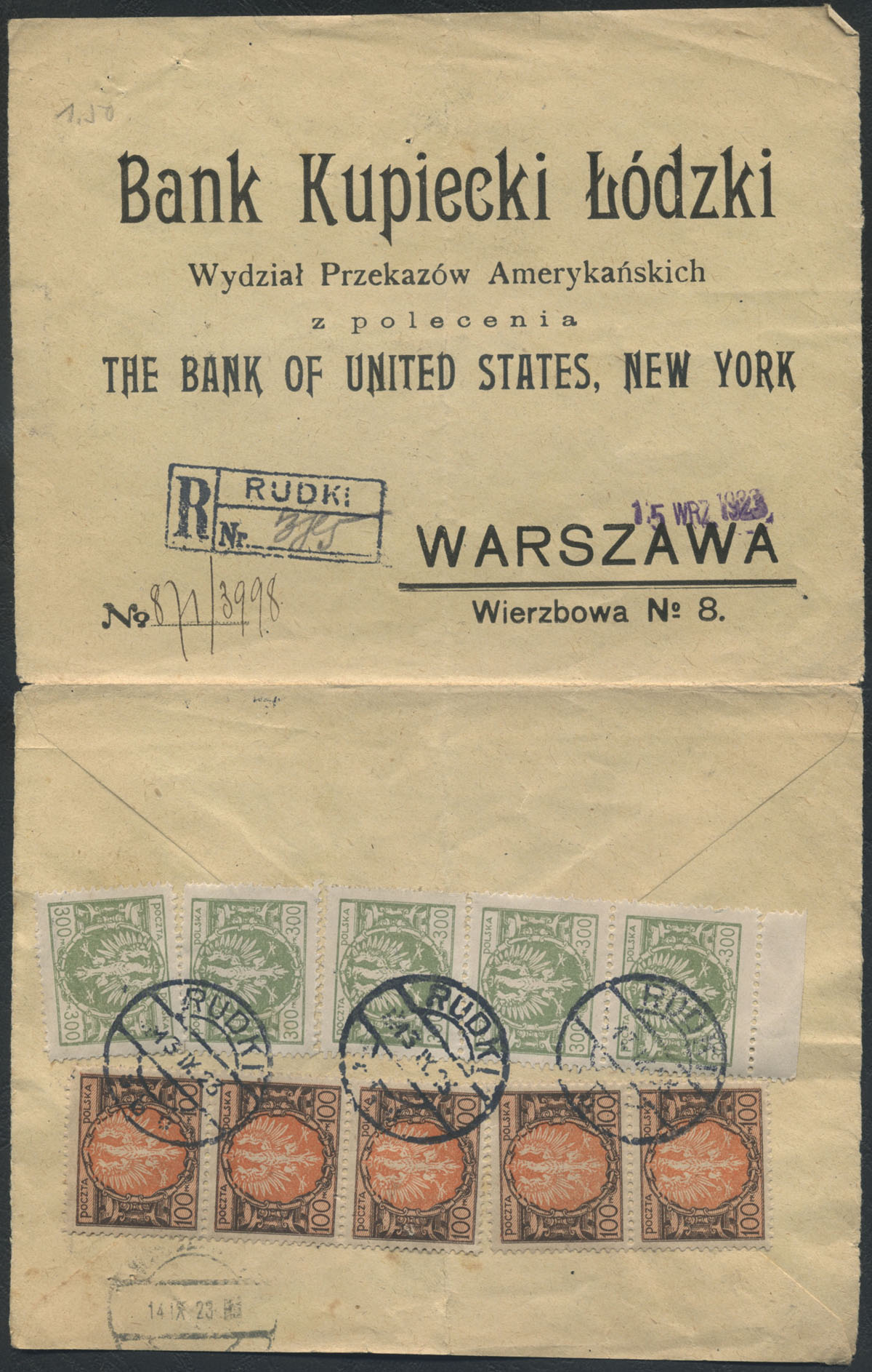 1923 firmowy list polecony z Rudki nadany 13.09.23 do Warszawy, koperta rozcięta po bokach. | |