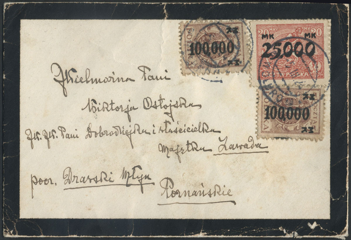 1924 hiperinflacja, list na kopercie żałobnej nadany 5.03.24 z Wolbromia do Zawady. | Fi.169, 171 |