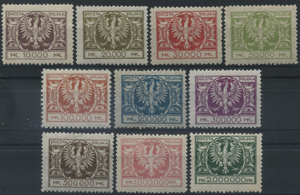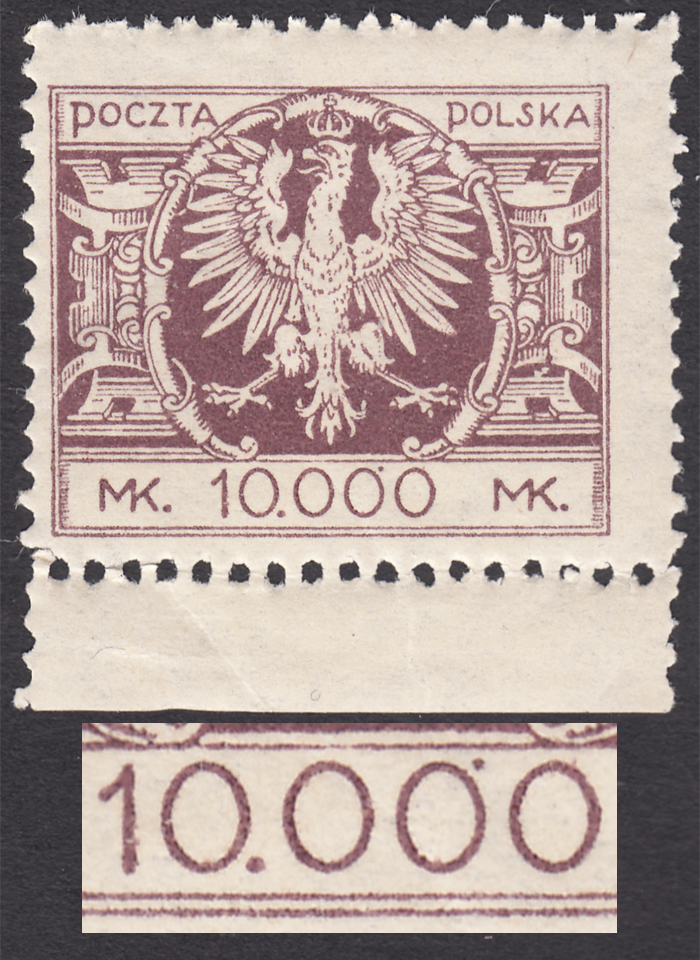 1924 Duży orzeł na tarczy barokowej, marginesowy znaczek za 10000 mk. z niekatalogowanym - ale opisanym w PZP pod numerem 4 i pokazanym na str.217 błędem "duża kropka nad trzecią cyfrą O", w PZP nie opisano pozycji błędu, ale to znaczek z ostatniego rzędu arkusza, gwarancja. | Fi.172 B Mi.191 |