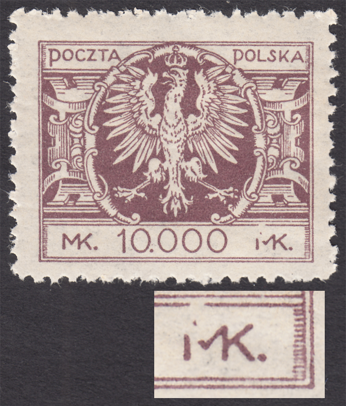 1924 Duży orzeł na tarczy barokowej, znaczek za 10000 mk. z niekatalogowanymi - ale opisanym w PZP pod numerem 1 i pokazanymi na str.217 błędami na poz.32 "mocno uszkodzone M w prawym MK" oraz "przerwana linia nad M", gwarancja i opis Walocha. | Fi.172 B Mi.191 |