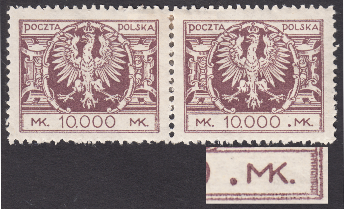 1924 Duży orzeł na tarczy barokowej, parka znaczków za 10000 mk. prawy z niekatalogowanym - ale w PZP pokazanym na str.217 błędem "bardzo duża kropka przed prawym MK", w PZP nie opisano tego błędu przez przeoczenie skoro go pokazano na następnej stronie, ładny stan zachowania na lekkich podlepkach, gwarancja i opis Walocha. | Fi.172 B Mi.191 |