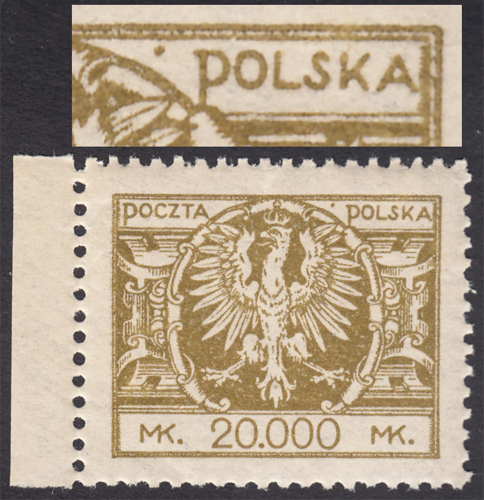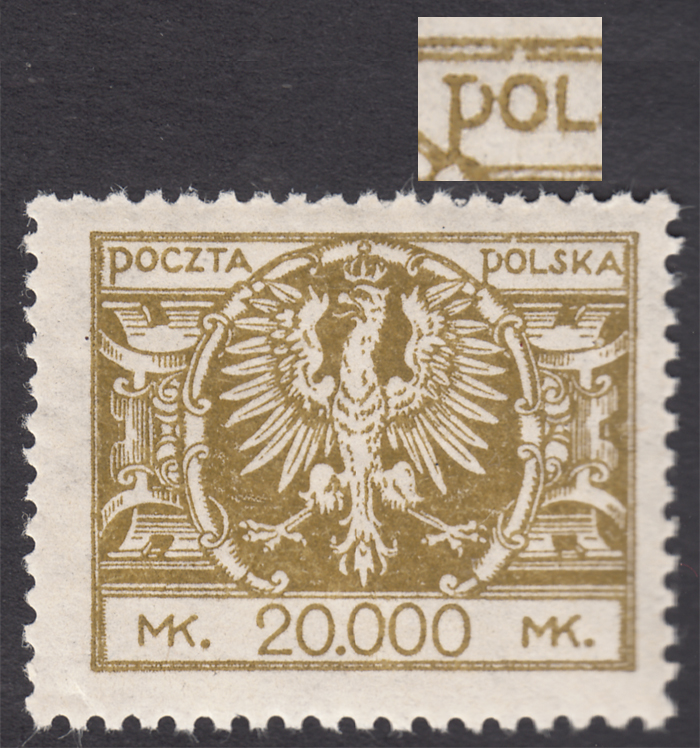 1924 Duży orzeł na tarczy barokowej, znaczek za 20000 mk. z niekatalogowanymi błędami na poz.85 "przerwa w brzuszku litery P" oraz "przerwana ramka nad literą O", gwarancja i opis Walocha. | Fi.173 B Mi.192 |