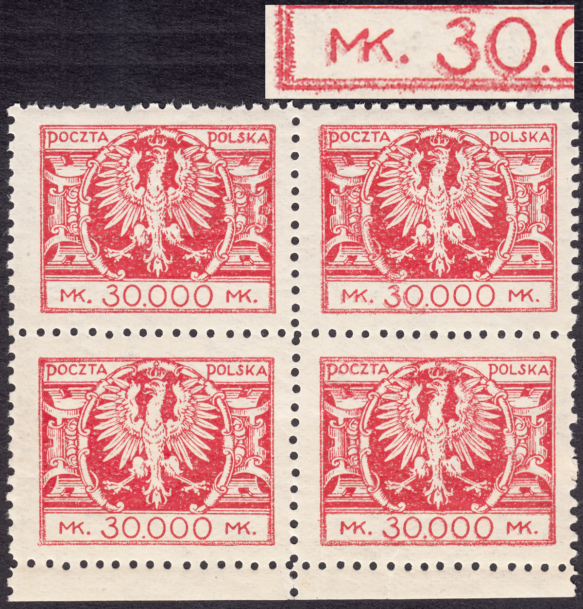 1924 Duży orzeł na tarczy barokowej, marginesowy czworoblok znaczków za 30000 mk., prawy górny z podwójnym drukiem szczątkowym "MK 30.", część znaczków z dwu dolnych rzędów została okienkowo wklejona do innego arkusza sprzedażnego - na dolnym znaczku widoczny fragment służącego do tego paska papieru, reszta arkusza mogła być bardziej zdeformowana i odrzucono ją pewno jako nie nadajacą się do eksploatacji, poza technologicznym fragmentem paseczka bardzo ładny stan zachowania, gwarancja i opis Walocha. | Fi.174 MK Dp Mi.193 |