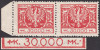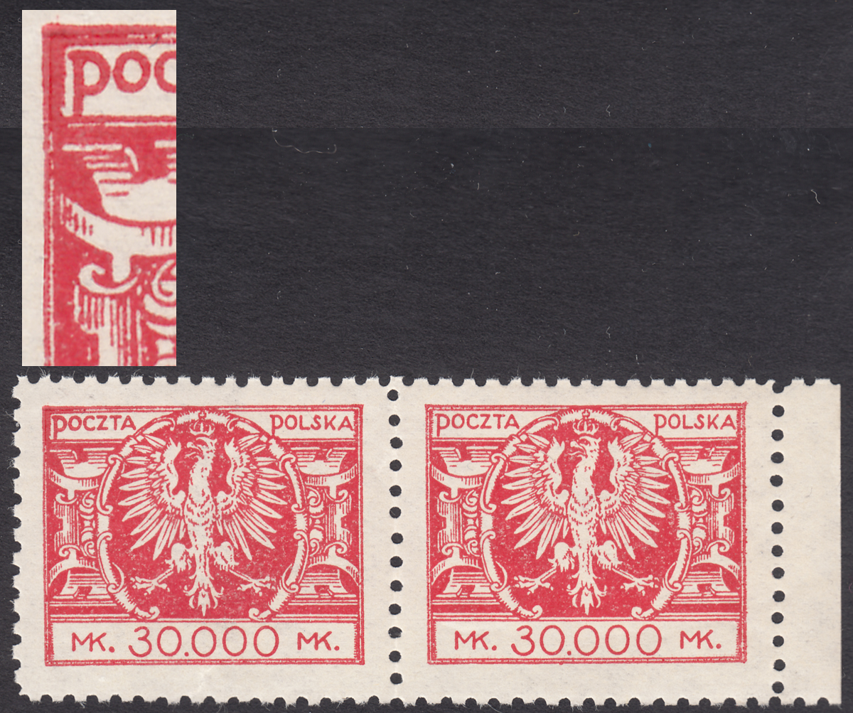 1924 Duży orzeł na tarczy barokowej, marginesowa parka znaczków za 30000 mk., lewy z trzema niekatalogowanymi błędami, w tym dwoma opisanymi w PZP pod numerem 14 i pokazanymi na str.217 "kropka przed lewym MK" i "dwukropek po prawym MK", trzeci błąd "pierwsze O połączone z ramką" nie był dotąd opisany, gwarancja i opis Walocha. | Fi.174 B Mi.193 |