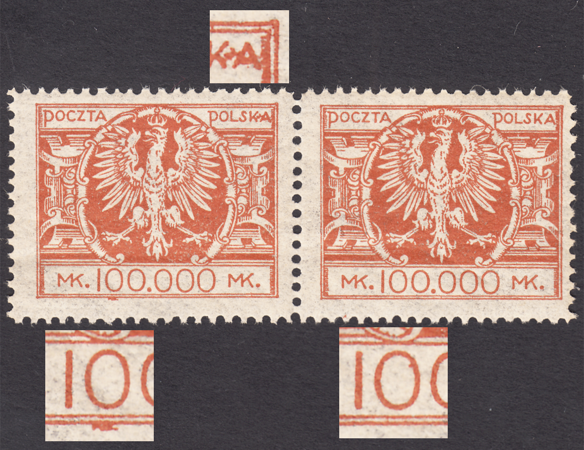 1924 Duży orzeł na tarczy barokowej, parka znaczków za 100000 mk., lewy z niekatalogowanymi błędami, pierwszym na poz.44 opisanym w PZP pod numerem 30 "kropka nad A w POLSKA" - tu bardzo dużym i drugim "plamka pod pierwszą cyfrą 0", a prawy z błędem na poza.45 "kropka w pierwszej cyfrze 0", gwarancja i opis Walocha. | Fi.176 B Mi.195 |