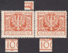 1924 Duży orzeł na tarczy barokowej, parka znaczków za 10000 mk. prawy z niekatalogowanym - ale w PZP pokazanym na str.217 błędem "bardzo duża kropka przed prawym MK", w PZP nie opisano tego błędu przez przeoczenie skoro go pokazano na następnej stronie, ładny stan zachowania z jedną pierwszą podlepką na środku, gwarancja i opis Walocha. | Fi.172 B Mi.191 |