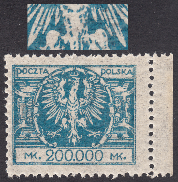 1924 Duży orzeł na tarczy barokowej, marginesowy znaczek za 200000 mk. z niekatalogowanymi znaczącymi błędami na poz.20 "duże skrzydło po lewej złamane" i "mniejsze skrzydło po prawej mocno złamane", gwarancja i opis Walocha. | Fi.177 B Mi.196 |
