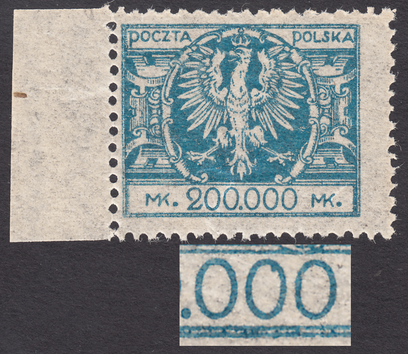 1924 Duży orzeł na tarczy barokowej, marginesowy znaczek za 200000 mk. z niekatalogowanym błędem na poz.41 "czwarte 0 z kropką w środku", gwarancja i opis Walocha. | Fi.177 B Mi.196 |