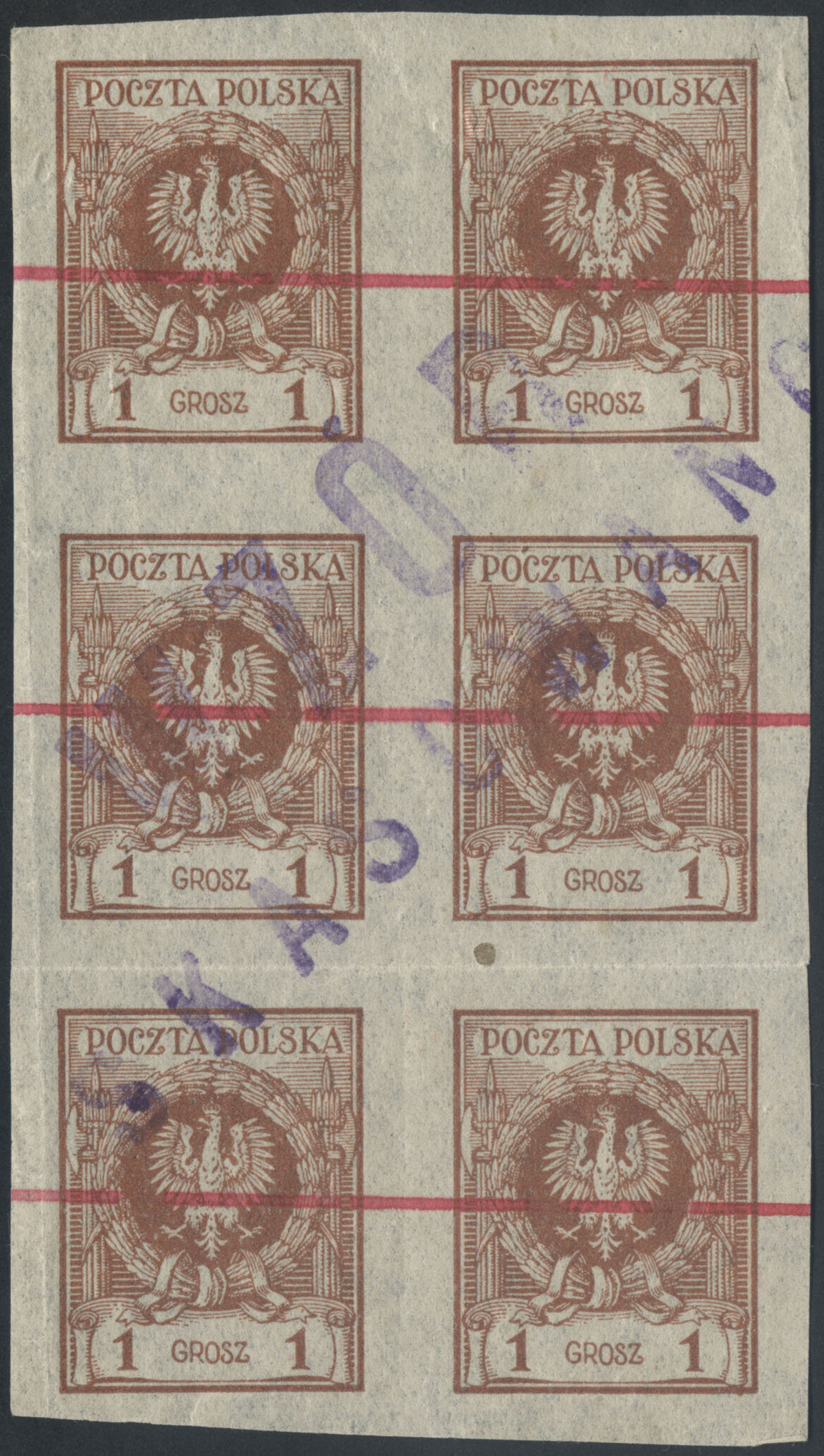 1924 orzeł w wieńcu, sześcioblok ciętych niegumowanych prób arkuszowych kreślonych czerwonym tuszem, stempel "WZÓR / SKASOWANO", gwarancja Ryblewski. | Fi.182P |