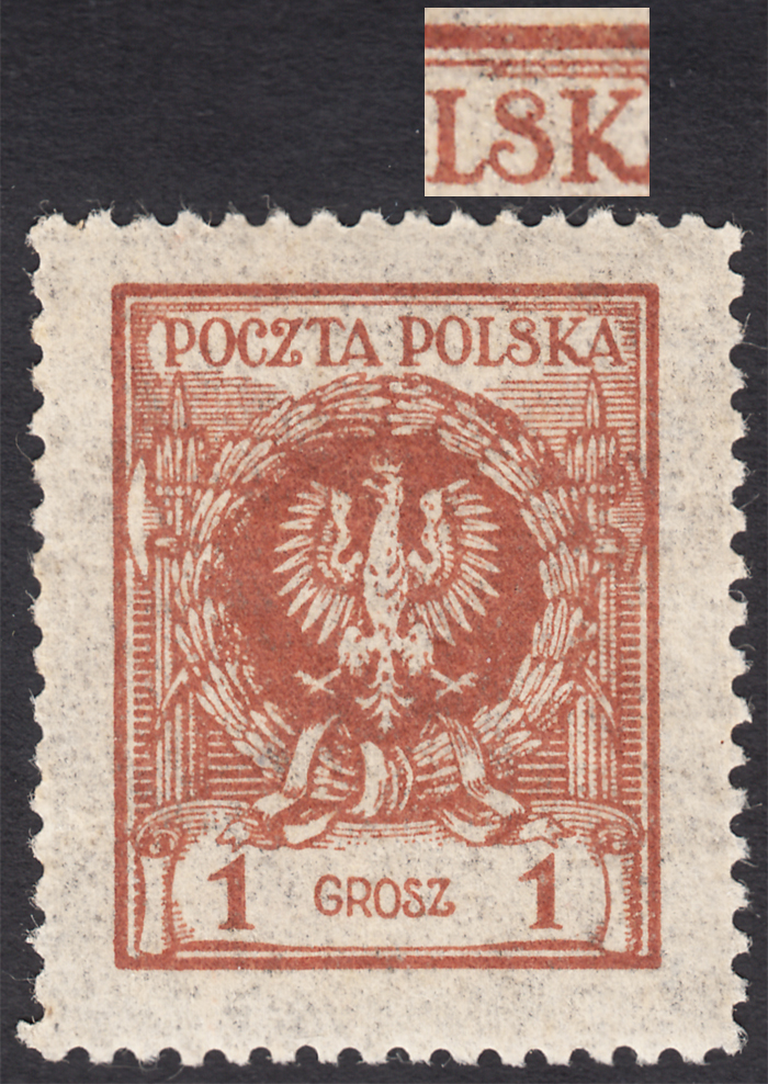 1924 Orzeł w wieńcu, znaczek za 1 gr. z niekatalogowanym - ale opisanym w PZP pod numerem 2, błędem "górny łuk litery S w POLSKA zamknięty", bardzo ładny stan zachowania, gwarancja i opis Walocha. | Fi.182 B |