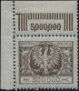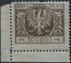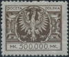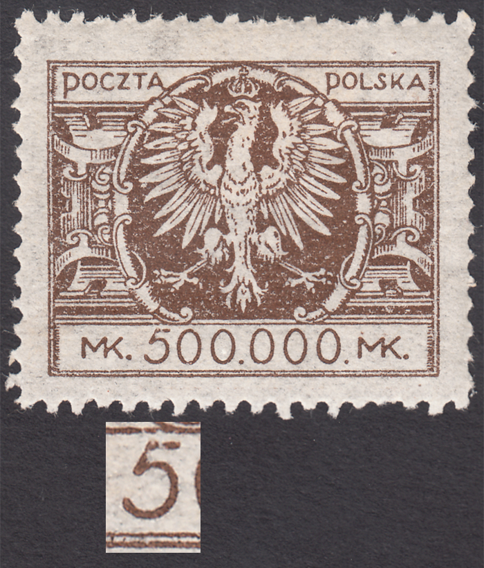 1924 Duży orzeł na tarczy barokowej, droższy znaczek za 500000 mk. z niekatalogowanym błędem "uszkodzona górna część cyfry 5", gwarancja i opis Walocha. | Fi.179 B Mi.198 |