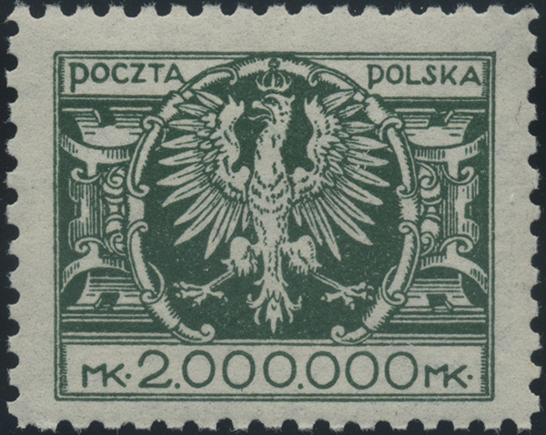 1924 Duży orzeł na tarczy, znaczek za 2000000 mk. z niekatalogowanym błędem na poz.63 "trójkącik na zakończeniu ornamentu", gwarancja i opis Walocha. | Fi.181 B Mi.200 |