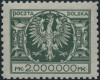 1924 Duży orzeł na tarczy, znaczek za 2000000 mk. z idealnym abklatschem - w tym wydaniu to rzadkie, nie jest gwarantowany bo będzie eksponowany od strony gumy. | Fi.181 MK Mi.200 |