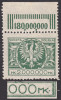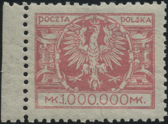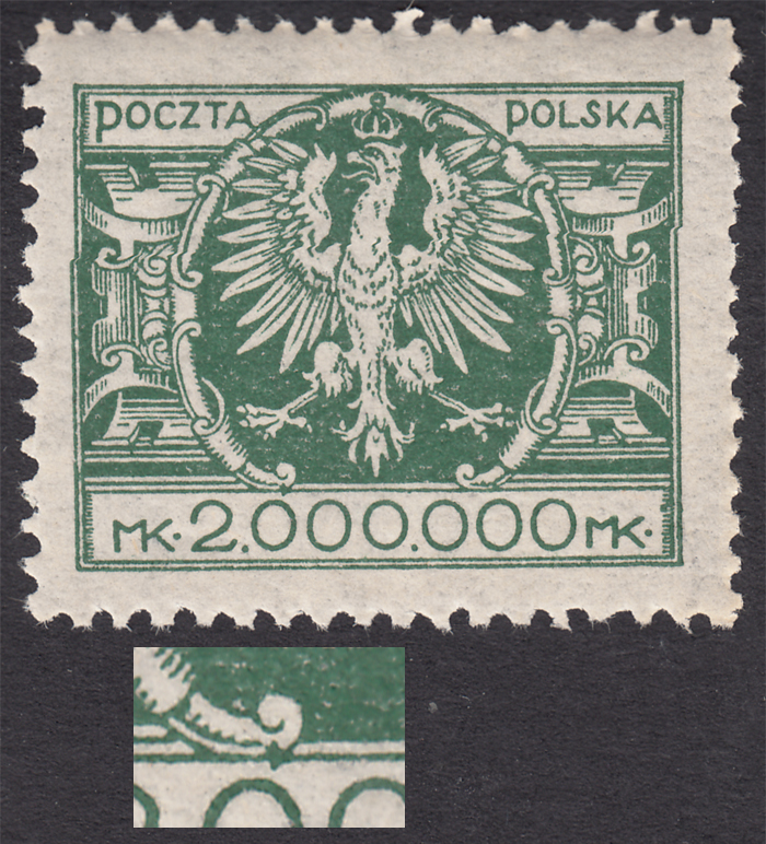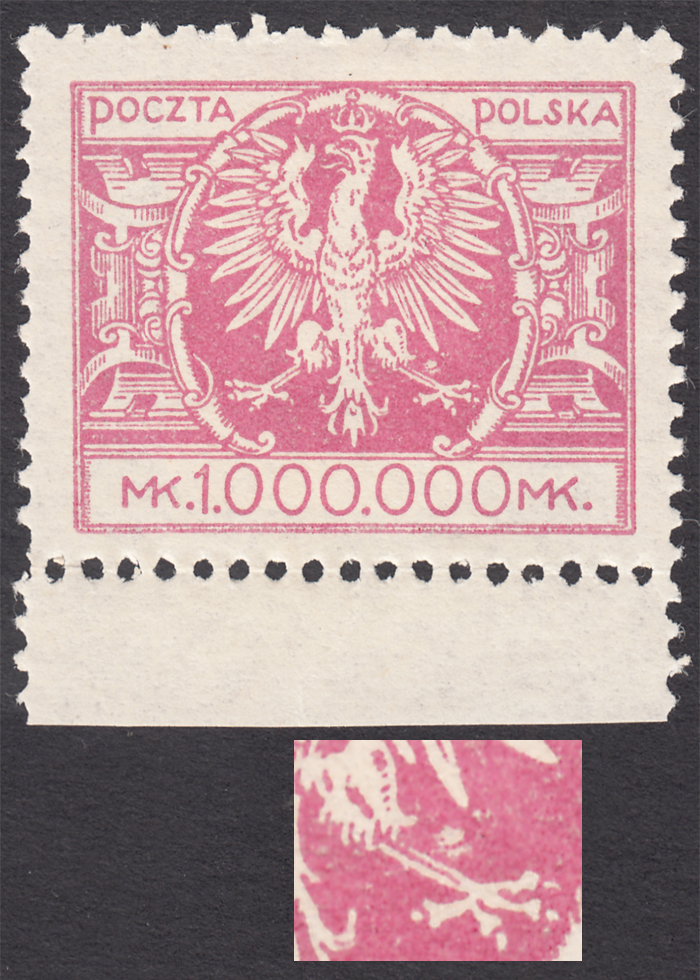 1924 Duży orzeł na tarczy, marginesowy znaczek za 1000000 mk. z niekatalogowanym - ale opisanym w PZP pod numerem 77 błędem na poz.81 w sektorze 2 "ostroga przy lewej łapie orła", gwarancja i opis Walocha. | Fi.180 B Mi.199 |