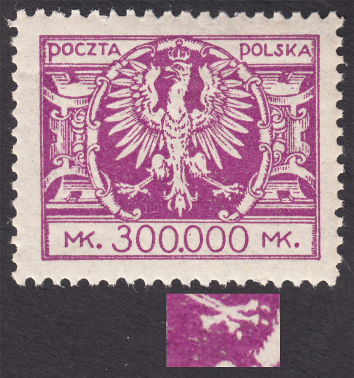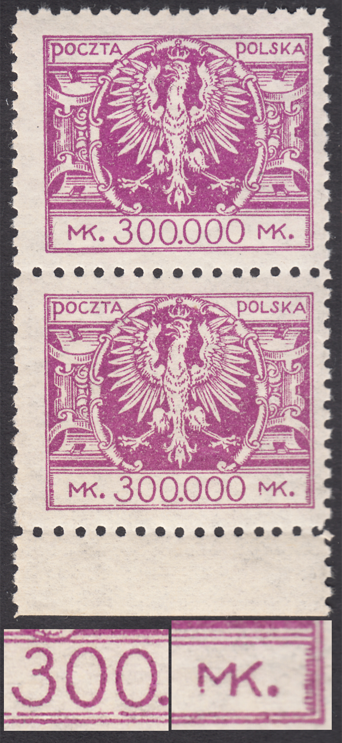 1924 Duży orzeł na tarczy barokowej, marginesowa parka droższych znaczków za 300000 mk., dolny z dwoma niekatalogowanymi błędami na poz.97 "złamana lewa nóżka M w prawym MK" i "dwie przerwy w wewnętrznej ramce pod 300", zalane kreskowanie pod A w POCZTA na górnym znaczku liczone jako zwykły znaczek, gwarancja i opis Walocha. | Fi.178 B Mi.197 |