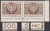 1924 Duży orzeł na tarczy barokowej, marginesowa parka droższych znaczków za 500000 mk. z niekatalogowanymi błędami, lewy na poz.99 "kropka po drugiej cyfrze 0", a prawy z opisanym w PZP pod numerem 50 błędem na poz.100 "dwukropek po prawym MK i kropka przed cyfrą 5" gwarancja i opis Walocha. | Fi.179 B Mi.198 |