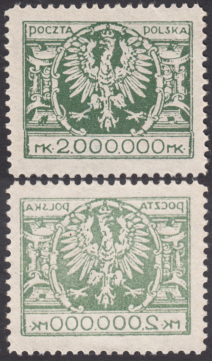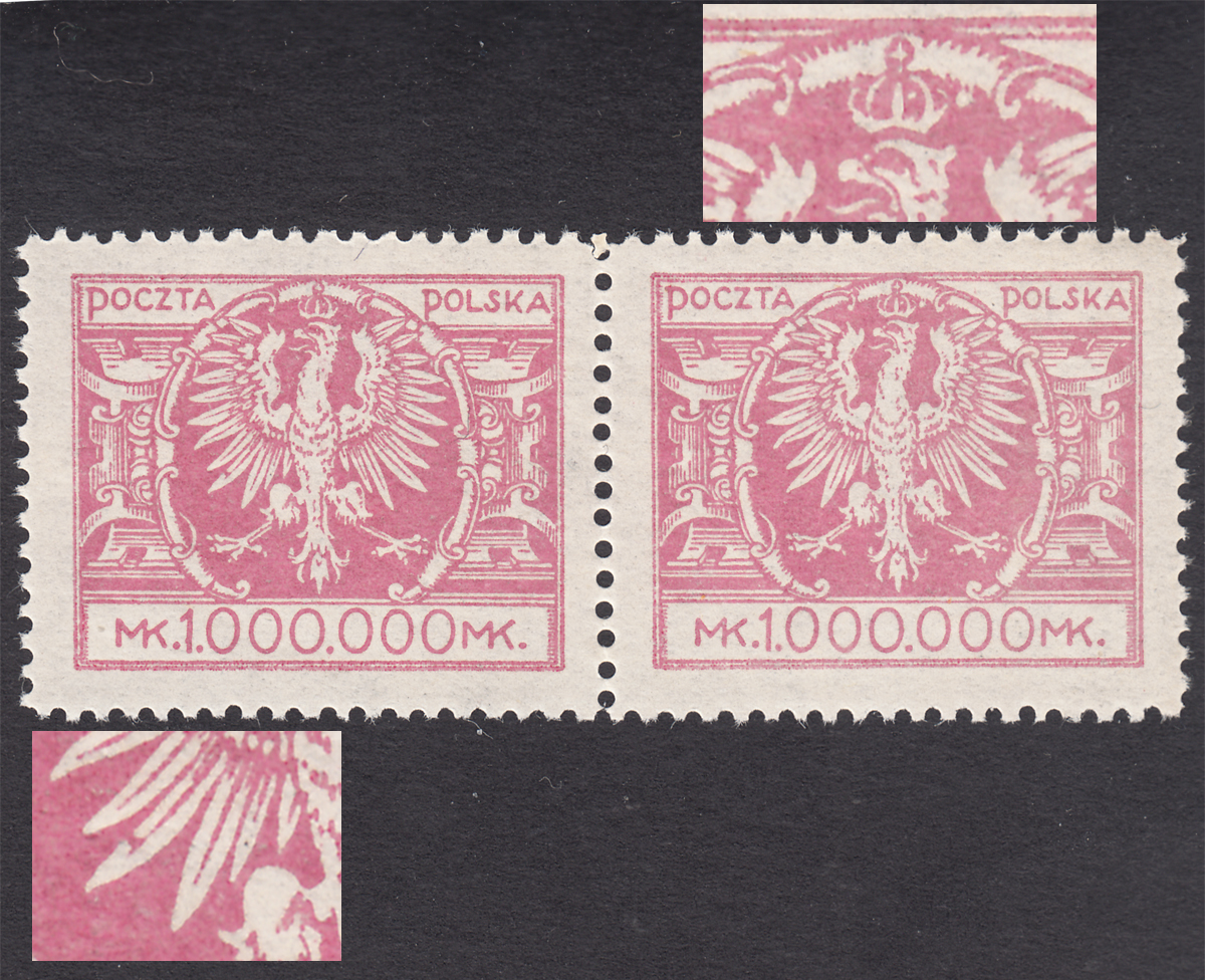 1924 Duży orzeł na tarczy, parka znaczków za 1000000 mk., oba z niekatalogowanymi - ale opisanymi w PZP pod numerami 65 i 66 błędami, na lewym znaczku z poz.24 "plamka na 9 piórze skrzydła orła", na prawym z poz.25 "plamka na prawo od korony", gwarancja i opis Walocha. | Fi.180 B Mi.199 |