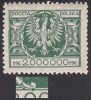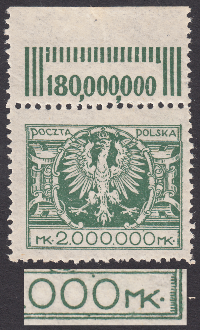 1924 Duży orzeł na tarczy, marginesowy znaczek za 2000000 mk. z niekatalogowanymi błędami na poz.9 "kropka pomiędzy piątym i szóstym 0" oraz "wcięcie w literze K", gwarancja i opis Walocha. | Fi.181 B Mi.200 |