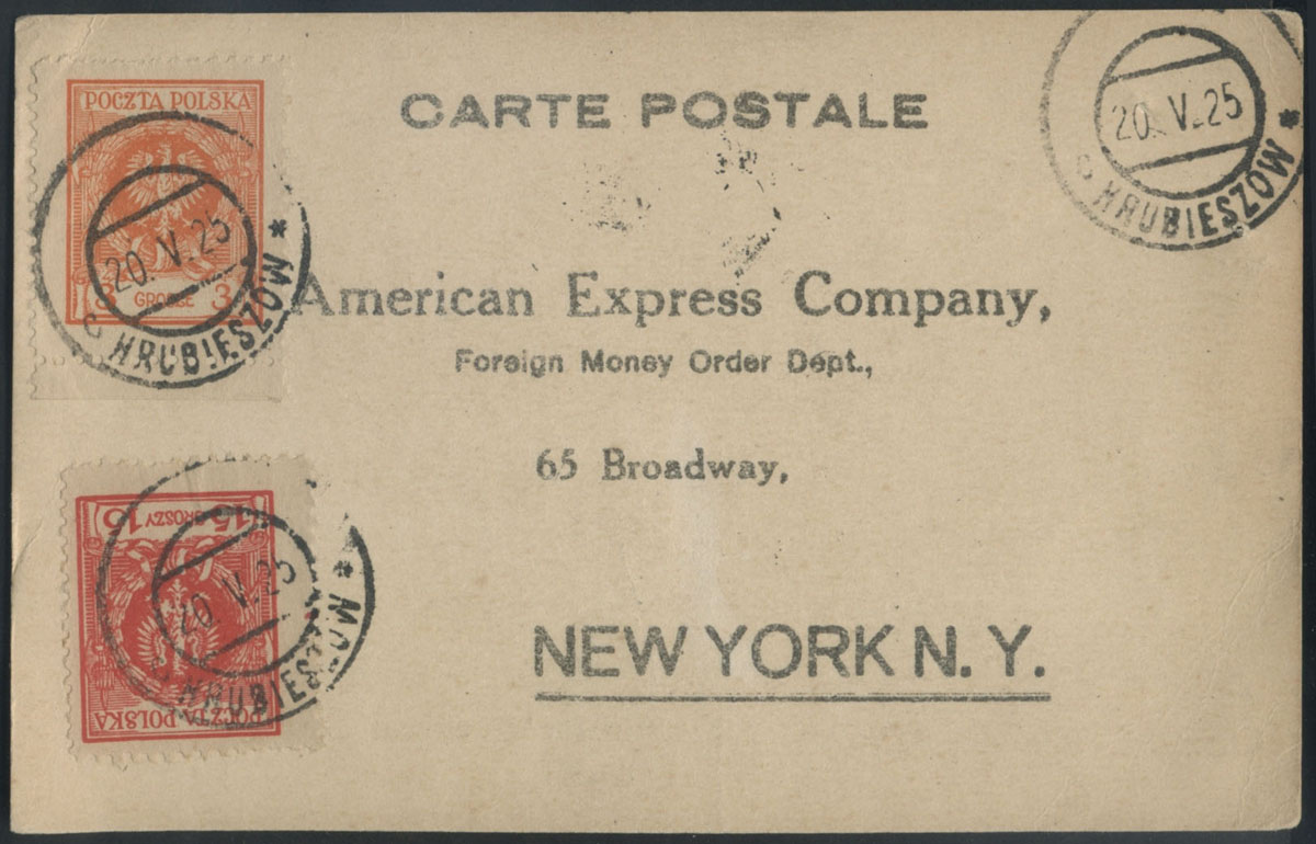 1925 kartka firmowa z Hrubieszowa do Stanów Zjednoczonych, poaustriacki unarodowiony kasownik. | Fi.184, 187 |