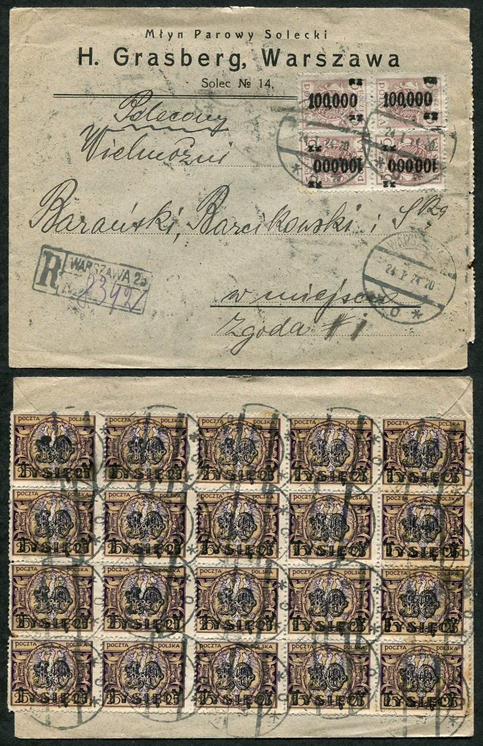 1924 Inflacja, koperta miejscowego listu poleconego wysłanego 24.01.1924 w Warszawie, okres inflacji, na kopercie 24 znaczki na kwotę 600.000 marek. | |