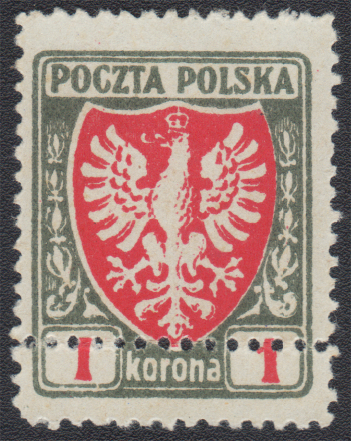 1919 wydanie Komisji Rządzącej, lokalnie perforowany znaczek za 1 ke. z podwójnym ząbkowaniem poziomym, dodatkowo niewielki błąd "wcięcia i przerwa wewnętrznej ramki wokół lewej cyfry 1", gwarancja Walocha. | Fi.65B B Mi.64 |