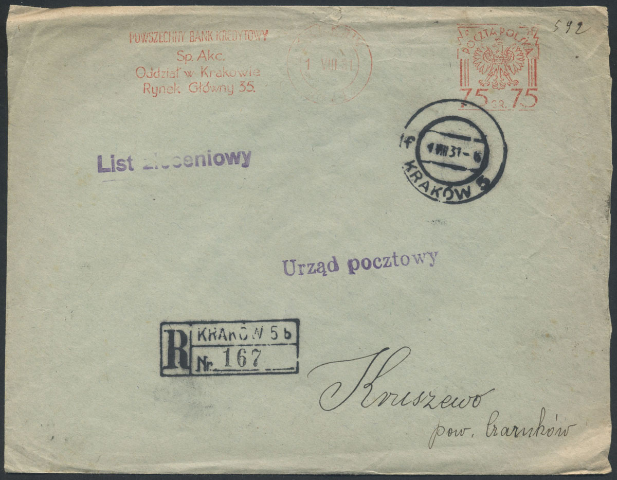 1931 list polecony z powszechnego Banku Kredytowego w Krakowie do Kruszewa opłacony frankaturą mechaniczną, na odwrocie stempel odbiorczy. | |