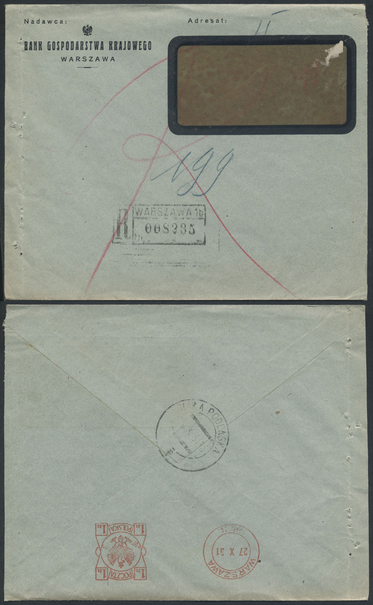 1931 list polecony z Banku Gospodarstwa Krajowego w Warszawie do Białej Podlaskiej opłacony na odwrocie frankaturą mechaniczną nr "A. 3.". | |